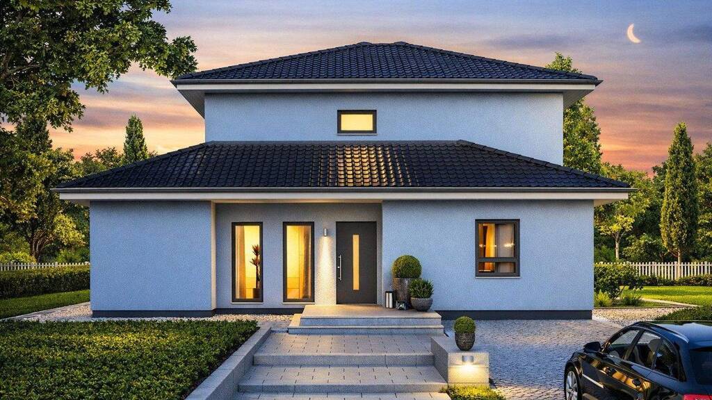 Die elegante Eingangssituation mit abgewalmtem Dach und umlaufender Walmdachfortsetzung erinnert an den mediterranen Baustil der Toskana und verleiht dem Haus eine stilvolle und zeitlose Ausstrahlung. Hier verbinden sich klare Architektur und mediterranes Flair zu einem Zuhause, das sofort begeistert.