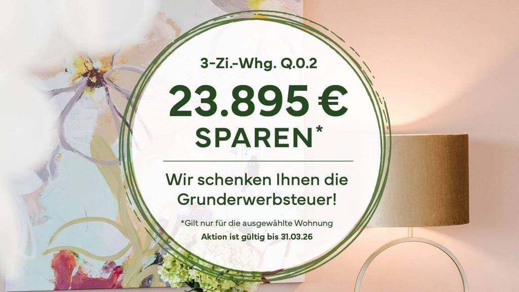 Sichern Sie sich jetzt einen attraktiven Kaufpreisvorteil für diese 3-Zimmer-Eigentumswohnung Q.0.2: Sie sparen 23.895 € gegenüber dem ursprünglichen Kaufpreis von 477.900 € und erwerben die Wohnung zum Vorteilspreis von 454.005 €.
