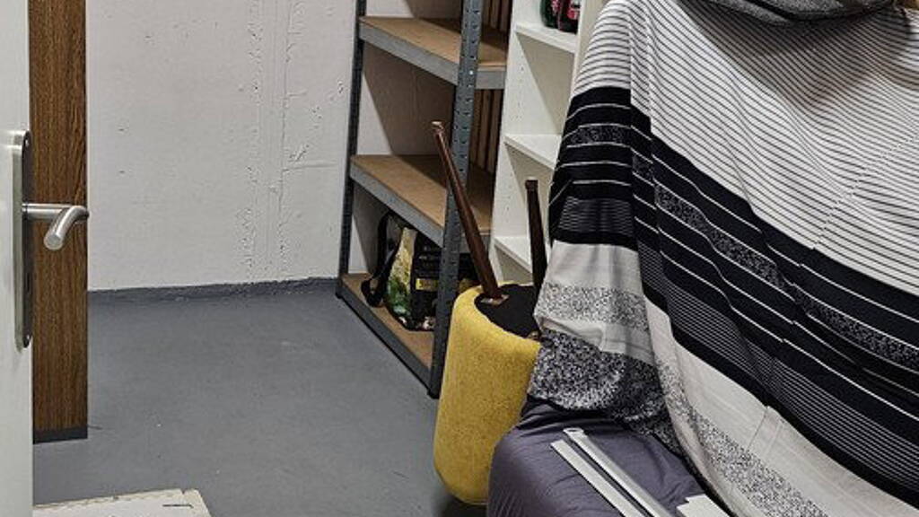 Abschließbarer Kellerraum mit Schränken und Regalen.