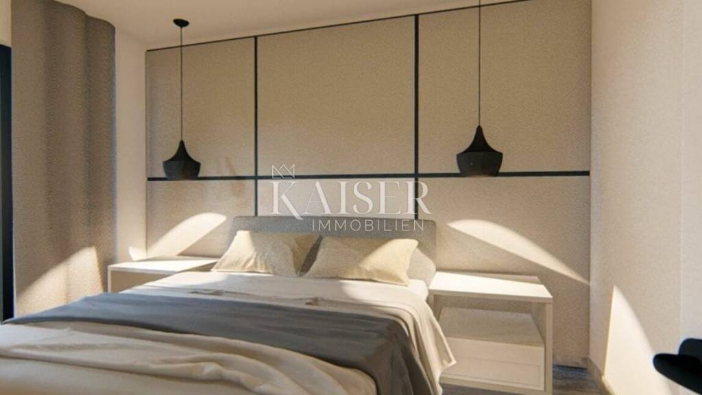 In einer ruhigen Straße in Diklo, nur wenige Schritte vom Meer und Strand entfernt, steht in einem Neubau die moderne Dreizimmerwohnung S2 zum Verkauf. Sie befindet sich im Erdgeschoss eines kleinen Wohnhauses mit insgesamt sechs Wohnungen. Diese elegant eingerichtete Wohnung mit 98,18 m² bietet die perfekte Kombination aus Luxus, Komfort und Privatsphäre und ist voll möbliert und ohne zusätzliche Investitionen bezugsfertig. Das Besondere an dieser Wohnung ist ein großzügiger privater Garten mit 160 m², der sich ideal zum Entspannen, für geselliges Beisammensein im Freien oder um Ihre eigene ruhige Ecke am Meer zu genießen eignet. Die Raumaufteilung der Wohnung wurde sorgfältig geplant, um ein Höchstmaß an Komfort und Funktionalität zu bieten. Der Eingangsbereich und Flur mit 7,15 m² führen zu allen Zimmern, während das Gäste-WC mit 2,10 m² und das elegante Badezimmer mit 3,50 m² und ebenerdiger Dusche Zweckmäßigkeit und modernes Design bieten. Wohnzimmer, Küche und Esszimmer bilden einen offenen Raum von 23,40 m², der dank großer, raumhoher Glaswände und extrabreiter Schüco-Schiebetüren mit natürlichem Licht durchflutet ist und direkt auf eine überdachte Loggia von 15,90 m² und einen wunderschön angelegten Garten führt. Schlafzimmer 1 ist 8,85 m² groß und Schlafzimmer 2 12,50 m², beide mit Einbauschränken und Premium-Betten. Im Keller gibt es einen Abstellraum von 7,55 m² und ein Garagenstellplatz in der Tiefgarage (Berechnungskoeffizient 1,68 m²) ist im Preis inbegriffen. Ein Aufzug führt direkt zur Wohnung und sorgt für maximalen Komfort und Privatsphäre. Die Wohnung wird mit Materialien und Technologie von höchster Qualität ausgestattet. Eine maßgefertigte Küche mit Premium-Geräten, maßgefertigte Möbel, Fußbodenheizung in der gesamten Wohnung und Klimaanlage in jedem Zimmer garantieren umfassenden Komfort. Aluminiumfenster mit Dreifachverglasung, elektrische Rollläden mit integrierten Moskitonetzen, Sicherheitstüren und eine Videostation mit Monitor unterstreichen das hohe Sicherheits- und Qualitätsniveau zusätzlich. Alle technischen Installationen, einschließlich Kabel-, ISDN- und TV-Anschlüsse, sind diskret installiert. In den Badezimmern gibt es keine sichtbaren technischen Geräte, und auch die Klimaanlagen sind nicht an der Fassade montiert, wodurch das gepflegte und elegante Erscheinungsbild des Gebäudes erhalten bleibt. Die Beleuchtung in warmen Farbtönen, einschließlich indirekter Beleuchtung im Wohnzimmer und auf der Loggia, verleiht dem Raum ein edles und angenehmes Ambiente. Die Wohnung liegt in einem exklusiven Viertel von Diklo und bietet Ruhe, Privatsphäre und die Nähe zu allen Annehmlichkeiten. Das Meer und der gepflegte Strand sind nur 70 Meter entfernt. In der Nähe befinden sich Geschäfte, Restaurants, Cafés und eine Bushaltestelle. Dank der Südausrichtung und der großen Glasflächen ist die Wohnung das ganze Jahr über äußerst hell und angenehm, während der große private Garten zusätzlichen Platz zum Genießen der Natur bietet - perfekt für Familie, Haustiere oder gemütliche Zusammenkünfte. Die Wohnung verfügt über ein Energiezertifikat der Klasse A, eine hochwertige Bauweise und eine hervorragende Schalldämmung. Damit ist sie die perfekte Wahl für ein Familienhaus, ein luxuriöses Wochenendhaus oder eine sichere Investition in einem der begehrtesten Viertel von Zadar. Die Maklerprovision für den Käufer beträgt 3 % zzgl. MwSt. und wird beim Kauf einer Immobilie nach Abschluss des ersten Rechtsgeschäfts fällig. Kontaktieren Sie uns vertrauensvoll für weitere Informationen und um einen Besichtigungstermin zu vereinbaren. Tel.: +385997031459 E-Mail: vedran@kaiser-immobilien.hr