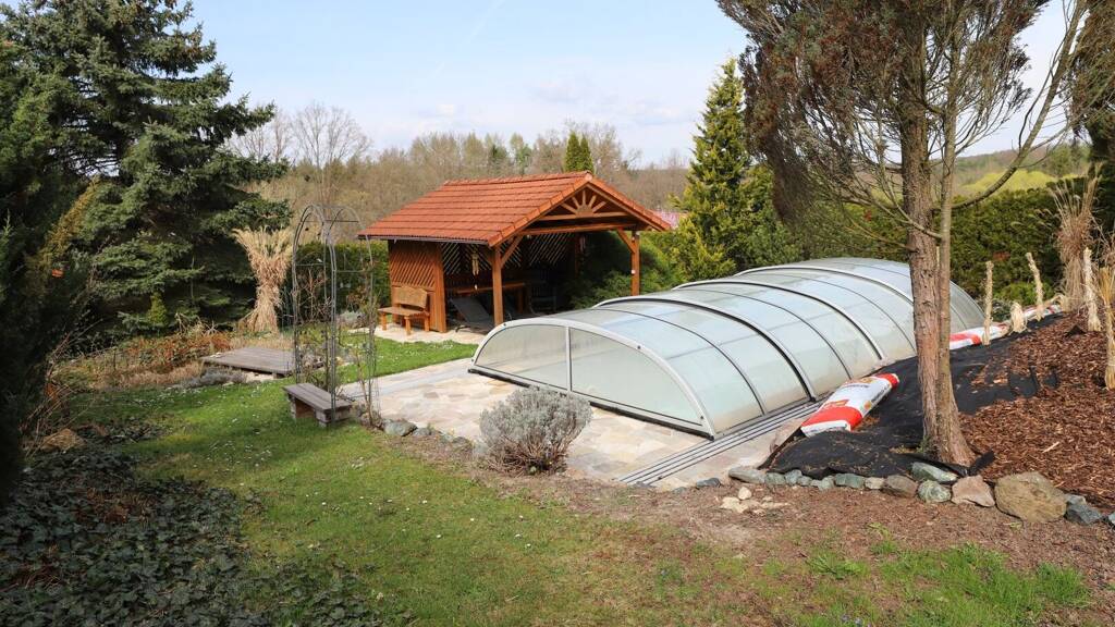 Im Garten befindet sich ein Pool samt Überdachung, eine große und kleine Pergola samt Sitzgarnitur, ein kleiner Teich sowie ein Gartenhäuschen für Gartengeräte.