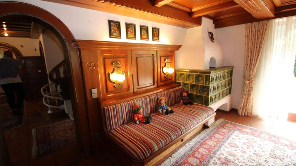 Wohn- und Esszimmer sind durch eine historische HolztĂĽr verbunden. Das Wohnzimmer verfĂĽgt ĂĽber einen charakteristischen Kachelofen.