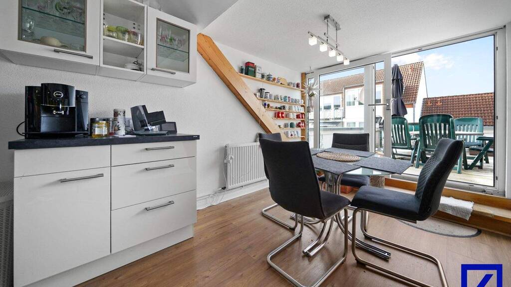 . Maisonette-Wohnung im Dachgeschoss . Sonnige, großzügige Dachterrasse . Vier gut nutzbare Zimmer . Badezimmer mit Dusche . Zusätzlich separates WC im oberen Bereich . Einbauküche . Abstellraum . Kellerraum . WG-geeignet . Brennwert Therme auf eigener Etage