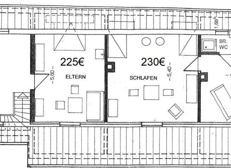 Dachgeschoss 2 kleine Tageslicht-Duschbäder mit WC Großer Vorraum (Wohnzimmer) 2 große Räume mit Dachfenstern und Waschbecken 2 Kammern (Gästezimmer)