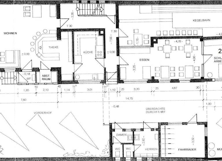 Erdgeschoss und Hof: Kneipe mit großer Theke Wirtschaftsküche mit 2 Gasherden und großem Abzug Frühstücksraum WG-Zimmer Kegelbahn