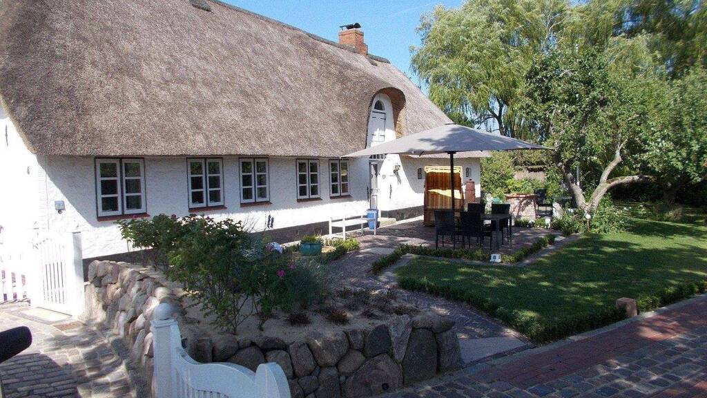 Mitten im Dorf und trotzdem abgeschieden - ein liebevoll eingerichtetes Reetdachhaus in einem verträumten Garten mit Blumen, alten Apfelbäumen und großem sattgrünem Rasen.
