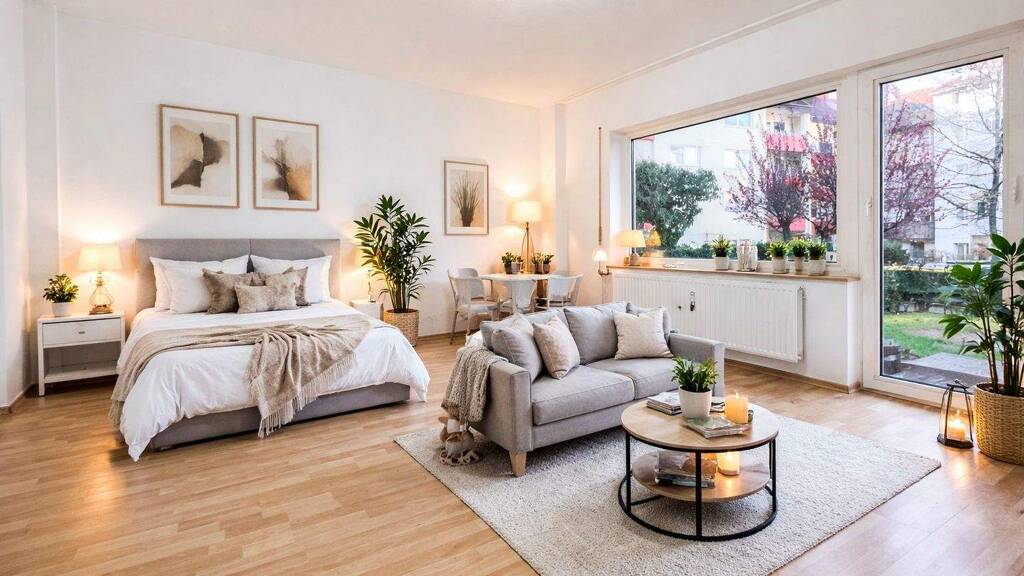 Die Wohnung liegt im Erdgeschoss und bietet auf ca. 44,6 m² Wohnfläche ein komfortables Zuhause für einen Ein- bis Zwei-Personen-Haushalt. Besonders hervorzuheben ist die funktionale Grundrissgestaltung, die eine optimale Nutzung der vorhandenen Fläche ermöglicht.