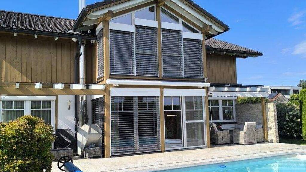 Ein zusätzlicher Raum eignet sich ideal als Homeoffice oder Gästezimmer. Ergänzt wird diese Ebene durch ein Gäste-WC, einen Hauswirtschaftsraum sowie einen praktischen Abstellraum. Großzügige Fensterflächen sind mit elektrischen Raffstores ausgestattet und sorgen für komfortablen Sonnen- und Sichtschutz bei optimalem Lichteinfall