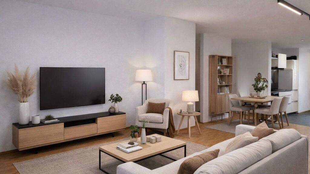 Der Mittelpunkt der Wohnung ist der groĂzĂźgige Wohn- und Essbereich mit offener Gestaltung. GroĂe Fensterflächen sorgen fĂźr viel Tageslicht und eine angenehme Wohnatmosphäre. Die offene Raumstruktur ermĂśglicht eine individuelle KĂźchengestaltung nach eigenen Vorstellungen. FuĂbodenheizung in allen Räumen sorgt fĂźr zeitgemäĂen Wohnkomfort.