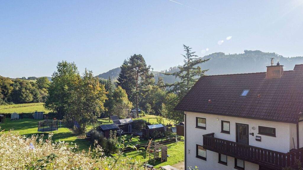 Der große Balkon lädt zum Entspannen ein. Genießen Sie die tolle Aussicht und lassen Sie Ihre Seele baumeln. Das dazugehörige Grundstück und der Garten, mit rund 425 m², bieten ausreichend Platz für Ihre Kinder und für gesellige Stunden mit Familie und Freunden.