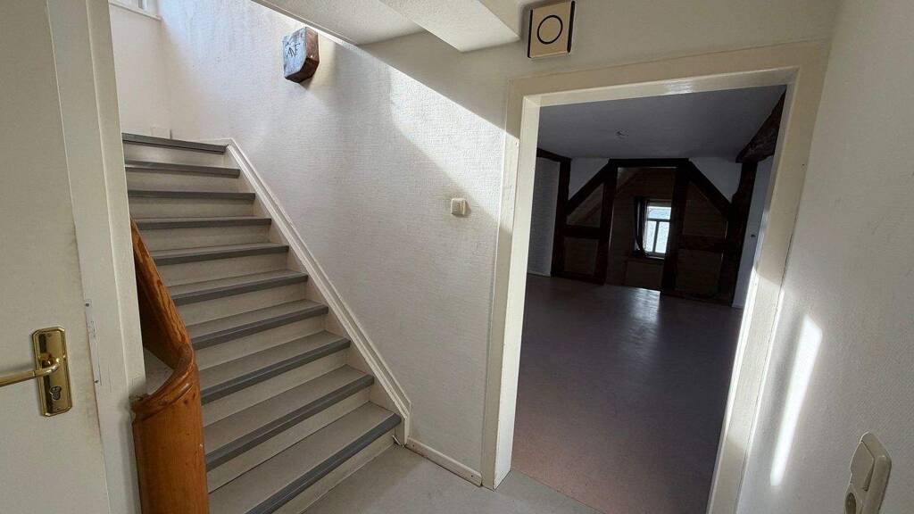 Wohnung: Obergeschoss: Wohnzimmer, Küche, Abstellraum Dachgeschoss: Drei Zimmer, Badezimmer