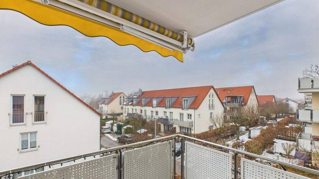 Der überdachte Balkon mit zusätzlicher Markise lädt zu entspannten Stunden im Freien ein - ob beim Frühstück am Morgen oder bei gemütlichen Abenden mit Blick in die ruhige Nachbarschaft.