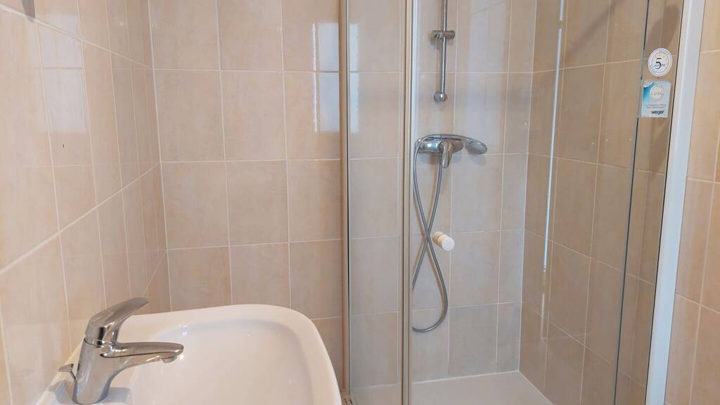Das modern verflieste Badezimmer ist mit einer bodenebenen Dusche, einem Handwaschbecken und einem Waschmaschinenanschluss ausgestattet. Im Badezimmer befindet sich ein Fenster, welches direkt auf den eigenen Balkon blickt. Das WC ist separat angelegt und ebenfalls modern verfliest.