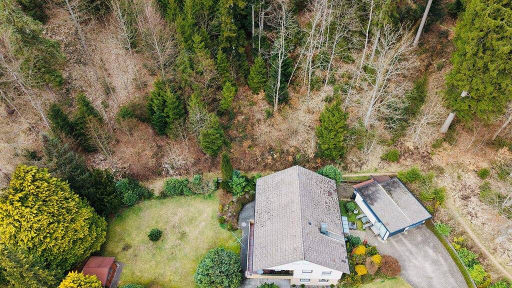Zur rechten Seite sowie zur Vorderseite beginnt unmittelbar die Natur der Wald schließt direkt an das Grundstück an. Zur gegenüberliegenden Seite eröffnet sich ein weiter Blick ins Tal, der zusammen mit der sehr guten Sonnenlage eine besonders angenehme und helle Wohnatmosphäre schafft.