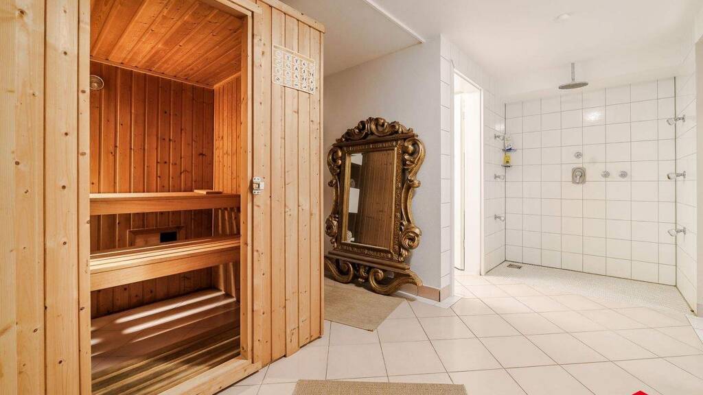 gestaltete Terrasse. Gegenüber dem Esszimmer befindet sich die große Küche (17,10qm) und dem angrenzenden kleinen Esszimmer für die Familie (21,15qm). Zusätzlich zum Haupteingang gibt es einen weiteren Eingang von der Doppelgarage über einen Flur von 8,2qm. Im 1. OG ist das Elternschlafzimmer (44,98qm) mit angrenzendem Bad (12,6qm) sowie weitere 4 Zimmer (15,84qm, 16,17qm, 18,02qm, 11,88qm) und 2 Bäder 5,76 und 4,25qm). Das Dachgeschoss hat weitere 4 Zimmer (31,92qm, 14,52qm, 19,08qm, 16,7qm) sowie 2 Bäder (jeweils 4,6qm). Wohnzimmer, Schlafzimmer und Kinderzimmer sind klimatisiert. Das Untergeschoss hat eine Sauna mit Ruheraum und Toilette/Dusche sowie einen großen Hobbyraum. Auch ist hier für viel Stauraum und einen Weinkeller gesorgt.