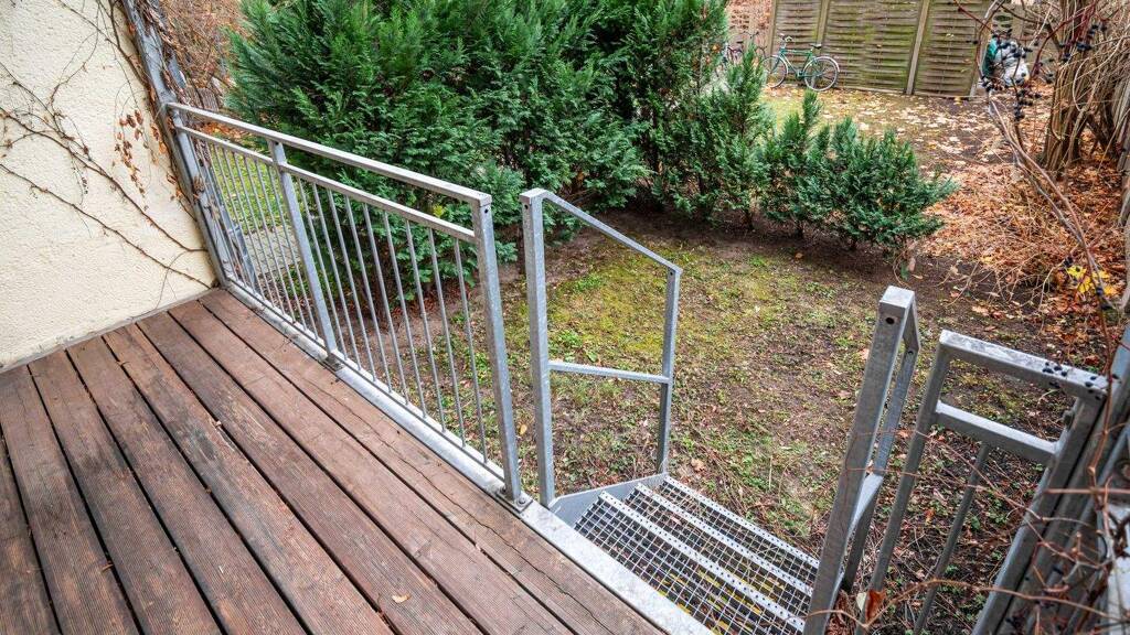 Bereits beim Betreten der Wohnung eröffnet sich ein weitläufiger Flur, der direkt in den offenen Küchenbereich führt. Hier befindet sich eine gepflegte Einbauküche. Von der Küche aus gelangt man auf den hofseitig gelegenen Süd-Balkon - ein sonniger Platz für entspannte Stunden im Freien. Über wenige Treppenstufen erreicht man zudem einen kleinen, separaten Gartenanteil, der ausschließlich zur Wohnung gehört und zusätzlichen privaten Freiraum bietet.