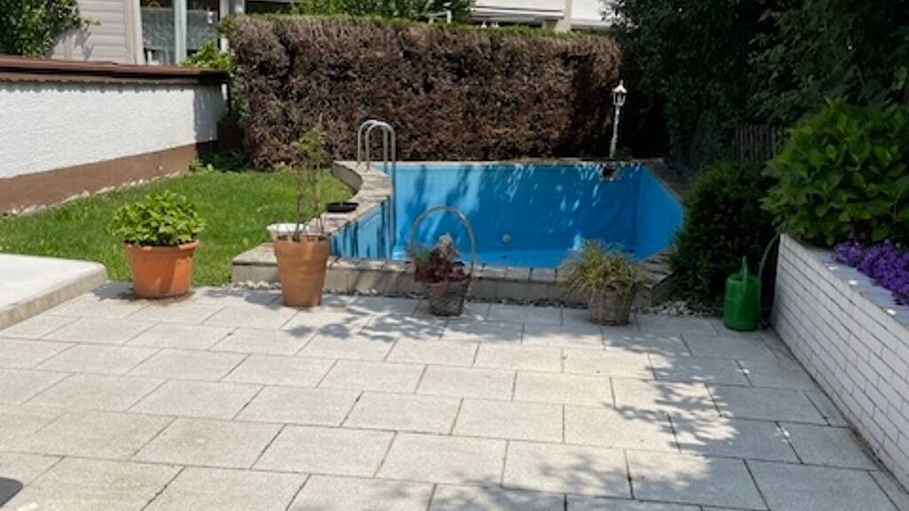 Die angrenzende Küche ist funktional gestaltet und ermöglicht einen effizienten Arbeitsablauf. Sie bietet genügend Stauraum und Arbeitsfläche, um kulinarische Kreationen zu verwirklichen. Vom Essbereich aus haben Sie Zugang zu einem kleinen, aber feinen Garten, der Teil des 204 m² großen Grundstücks ist. Ein toller Pool wird im Sommer das Highlight des Gartens sein. Dieser Außenbereich lädt zum Entspannen und Verweilen ein und bietet Raum für individuelle Gestaltungsideen.
