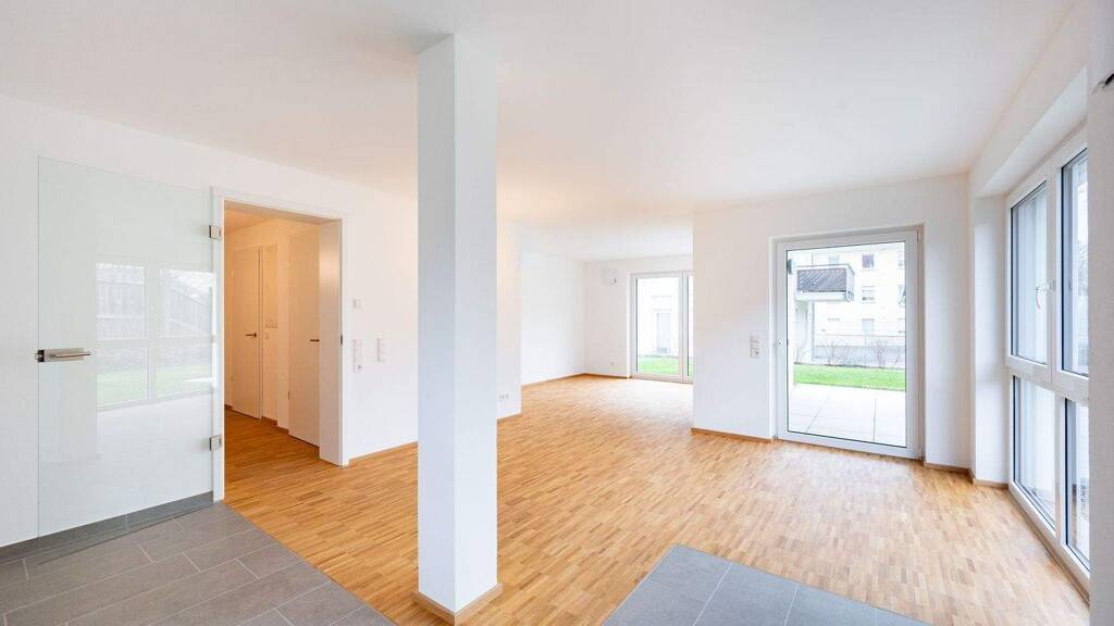 Im Mittelpunkt der Wohnung steht der große Wohn-, Ess- und Kochbereich. Großflächige Fenster- und Türelemente sorgen für eine helle, offene Atmosphäre und schaffen eine fließende Verbindung zur nordwestlich ausgerichteten Terrasse. Hier entsteht ein zentraler Lebensraum mit angenehmer Weite und klarer Unterteilung zwischen Kochen, Essen und Wohnen.