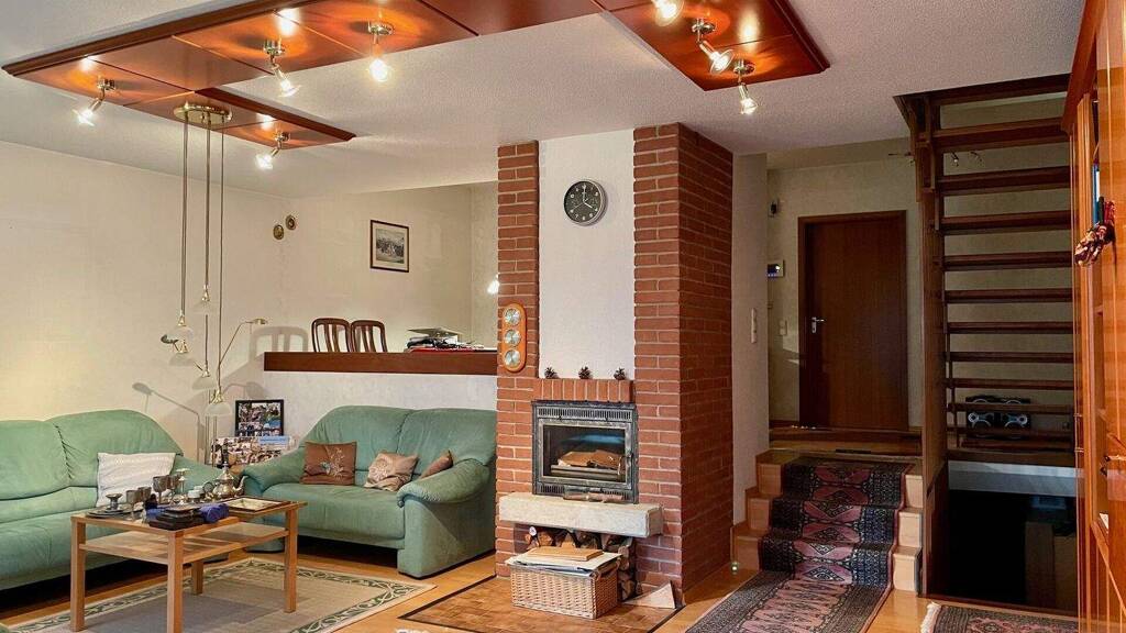 Über wenige Treppenstufen gelangen Sie in das lichtdurchflutete Wohnzimmer, das mit seinem warmen Ambiente und dem direkten Zugang zur Terrasse und zum gepflegten Garten überzeugt. Im Garten befindet sich ein charmantes Gartenhaus aus Holz - ideal zum Entspannen, für Hobbyprojekte oder als zusätzlicher Rückzugsort