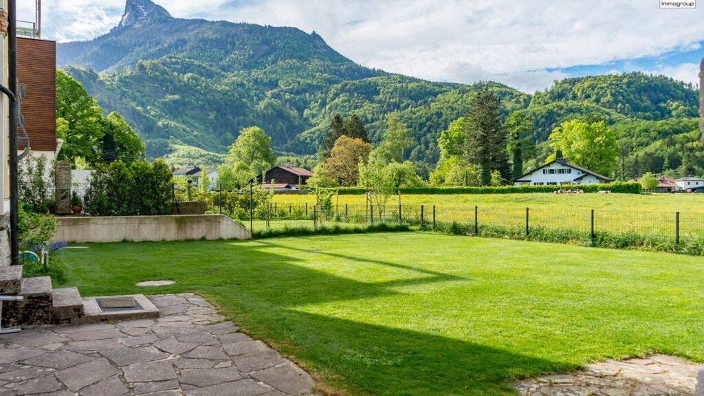 Auf der Rückseite der wunderschönen Villa öffnet sich die unter Naturschutz stehende Landschaft mit Wiesen und Berge und gibt den Blick auf den berühmten Schafberg sowie die beeindruckende Drachenwand frei.