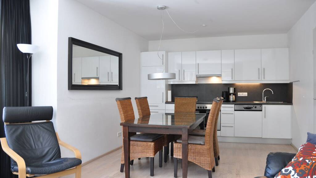 Was diese Ferienwohnung so speziell macht ist das überaus helle Wohnzimmer mit der großen Eck- Fensterfläche nach Westen sowie hinunter in das Gasteinertal. Vom Esstisch wie auch von der Couch aus genießt man hier eine großartige Aussicht. Die Küche ist modern und gut ausgestattet. Der große Esstisch bietet Platz für 8 bis 10 Personen.