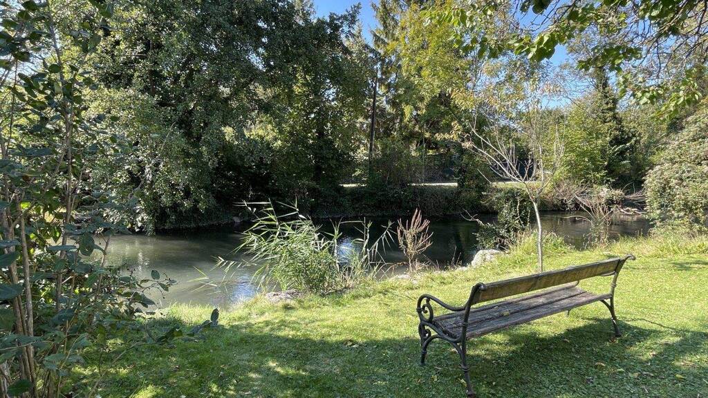 Der wunderschön angelegte Garten mit gepflegtem Rasen (inkl. Rasenroboter) und mehreren überdachten Terrassen lädt zum Entspannen ein und bietet einen unvergleichlichen Blick auf die Fischa, die direkt an das Grundstück grenzt - ein Ort, der Ruhe und Naturverbundenheit vereint.