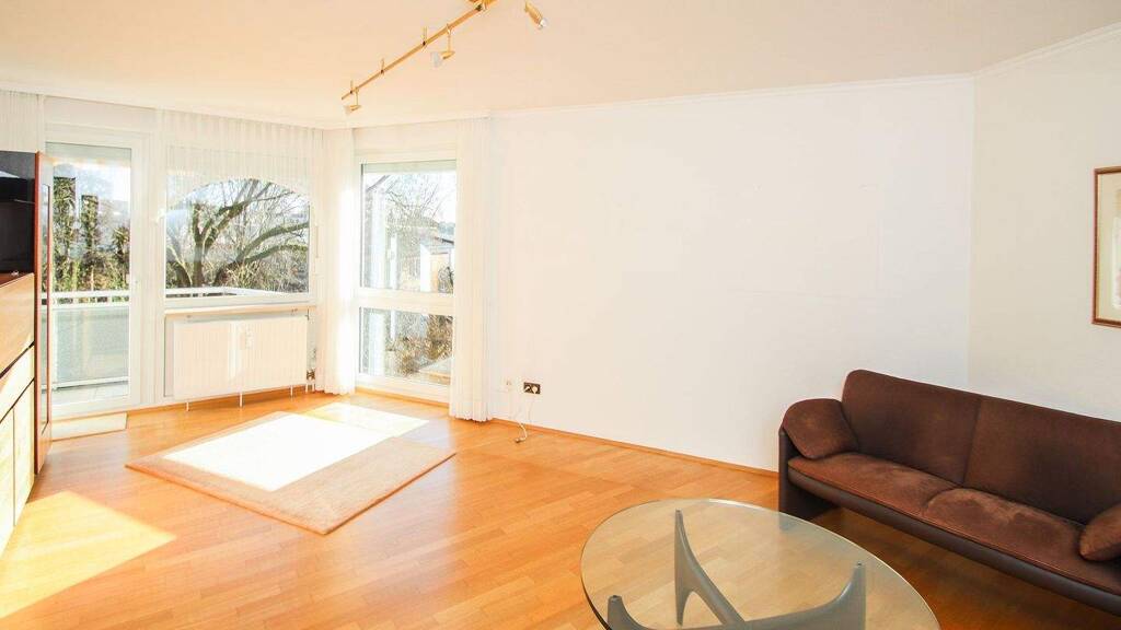 Das lichtdurchflutete Wohnzimmer mit Platz für den Essbereich und Zugang zum überdachten Balkon lädt zu gemütlichen Stunden mit Familie und Freunden ein. Der Ausblick geht direkt ins Grüne.
