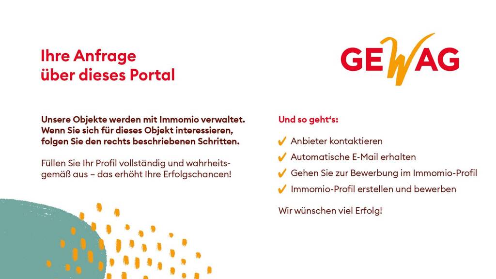 Für die Wohnung ist ein Wohnberechtigungsschein Typ B erforderlich, dieser muss beim Wohnungsamt der jeweiligen Gemeinde beantragt werden. Die Treppenhaus und Flurreinigung sowie die Schnee und Eisbeseitigung werden durch ein Unternehmen ausgeführt und sind Bestandteil der Nebenkosten (jährliche Abrechnung). Ebenso muss ein Betreuungsvertrag mit der Diakonie abgeschlossen werden. Ohne diesen Vertrag ist leider kein Bezug des Hauses möglich.