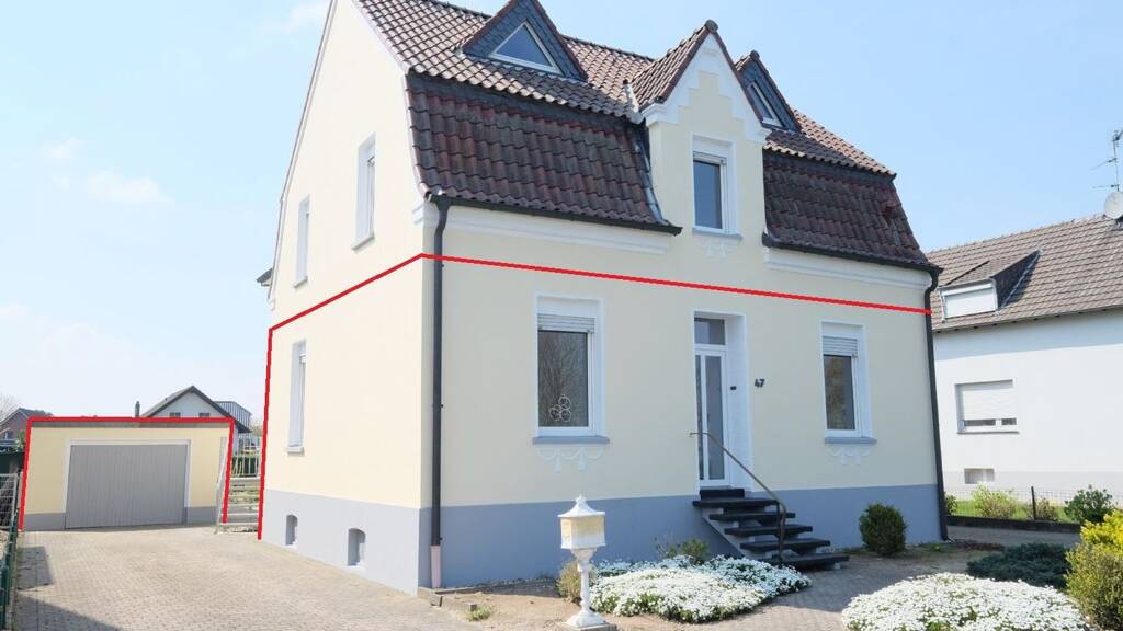 Die Immobilie wurde ca. 1900 errichtet und der Anbau ist ca. 1996 realisiert worden. Die Wohnung ist unter anderem ausgestattet mit Fensterrahmen aus Kunststoff und doppelverglasten Fenstern. Von der Diele aus befindet sich rechts das gemĂĽtliche Wohnzimmer und gleich anschlieĂźend die KĂĽche. Auf der linken Seite liegen die zwei Schlafzimmer und am Ende des Eingangsbereiches befindet sich das Badezimmer, das ausgestattet ist mit einer Dusche, einem Waschtisch und einer Toilette.