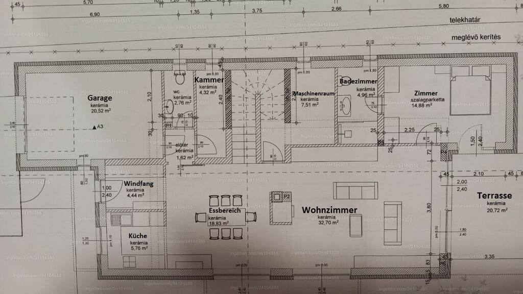 Die Aufteilung ist wie folgt: 4 Schlafzimmer, offene Küche, Wohnzimmer, 3 Badezimmer, Abstellraum, Waschküche, überdachte und offene Terrassen, Garage.