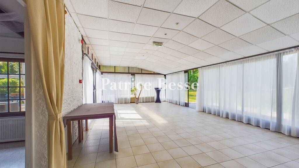The main entrance to the mansion is via a small flight of steps leading to the current reception, which has a wooden desk and a floor paved with artificial stone slabs. The reception leads to several rooms, including a vast dining room of more than 100 m² boasting a ceiling bordered by a cornice, walls with wainscotting, a tiled fireplace, a second fireplace with jambs, lintel and mantelpiece in moulded marble, and wood stripped flooring. A door at the end of the dining rooms leads to two connecting meeting rooms with wood stripped flooring and fireplaces. Next to these rooms, there is a hallway leading to an exit and a staircase.