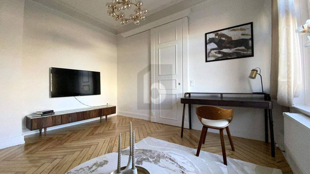 Stilvoll Leben in einem wunderschönen Jugendstilgebäude mit historischen Charme und modernem Wohnkomfort. Aufwendig restaurierte Stuckornamente und elegantes Fischgrätparkett verleihen den Räumen eine warme und einladende Atmosphäre. Die voll ausgestattete EBK überzeugt mit hochwertigen Geräten und einer edlen Steinarbeitsplatte. Das kernsanierte Badezimmer bietet modernen Komfort mit einer hochwertigen Dusche, Handtuchheizung und einem praktischen Waschtrockner. Im großzügigen Wohnzimmer sorgt ein Arbeitsplatz für ideale Home-Office-Möglichkeiten, während der Smart-TV für beste Unterhaltung sorgt. Mit einem hochwertigen Boxspringbett ausgestattet für garantiert erholsame Nächte.
