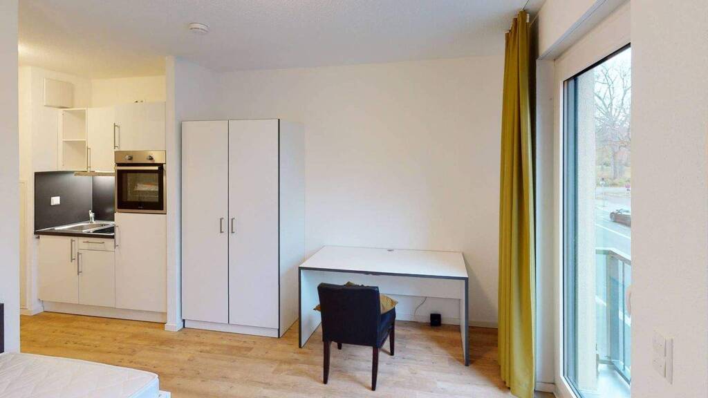 Der Wohn- und Schlafbereich ist das Herzstück der Wohnung, hier grenzt der Balkon an. Neben Sideboard und Sessel hast du auch einen Schreibtisch in deiner neuen Wohnung. Hier kannst du fleißig lernen und dir eine gemütliche Pause auf der Dachterrasse in den Innenhof gönnen. Das Schlafzimmer ist mit einem Bett und einem Kleiderschrank eingerichtet.