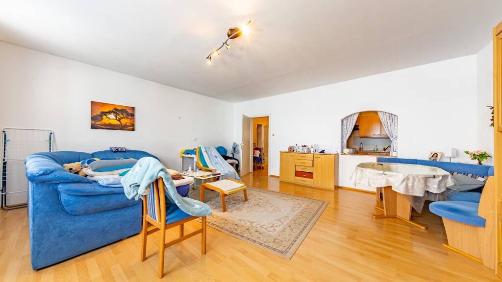 Die Böden in den Wohnräumen sind mit Melaminböden ausgelegt und das Bad, die Toilette, das Büro sowie der Gang sind verfliest. Die besagte Wohnung befindet sich im ersten Stock und zur Wohnung gehört noch ein Abstellraum im Gang. Das Objekt wird mittels Stromheizung beheizt. Ein Gasanschluss befindet sich bereits im Haus, sodass eine Umstellung auf Gas auch gegeben ist.