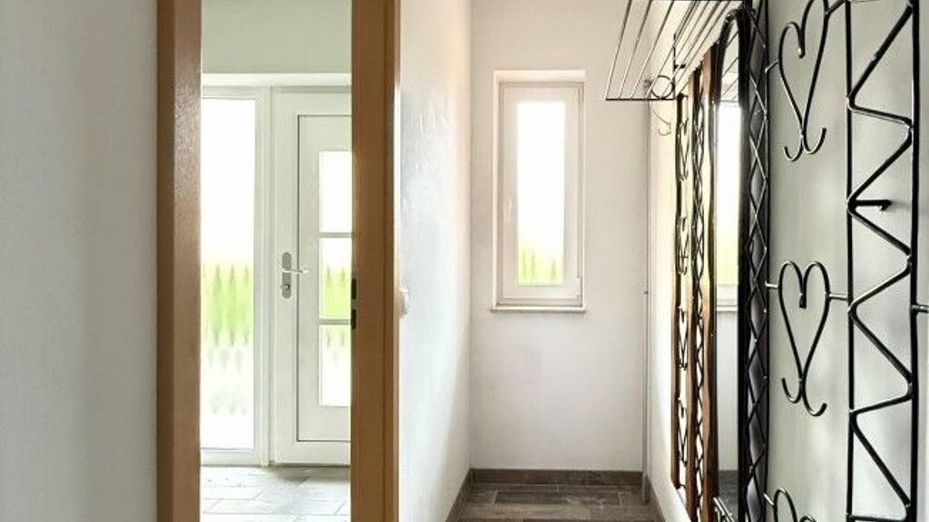Der Hauseingang ist mit einem Podest gestaltet, an dem bei Bedarf jedoch eine Schwellenrampe o. ä. angebracht werden könnte - somit ist/wäre eine perfekte Ausgangssituation für ein barrierefreies, seniorengerechtes Wohnen gegeben.