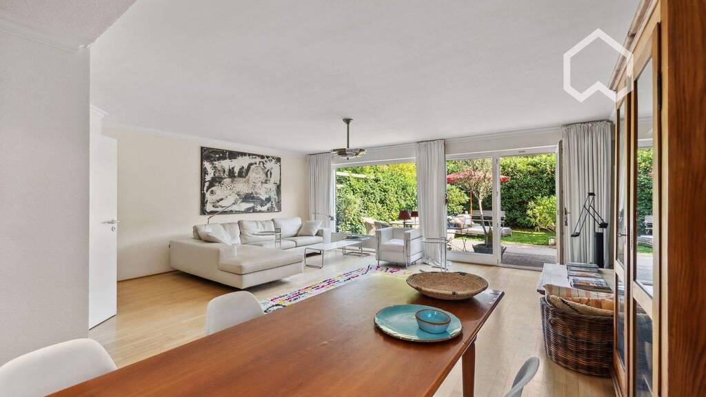 Dieses Haus ist perfekt ausgestattet. Es lässt keine Wünsche übrig. Der großzügige offene Wohn-, Ess- und Küchenbereich öffnet sich zur mediterranen Terrasse. Die offene Küche mit hochwertigen neuen Einbaumöbeln umfasst eine Miele Kochzone mit deckenbündiger Abluftführung, Kombi-Backofen mit Mikrowelle, Kombi-Dampfgarer, sowie eine Spülmaschine und Kühlgefrierkombination ebenfalls von Miele. Vom angrenzenden Essbereich hat man einen herrlichen Blick in den Wohnbereich und den mediterranen Garten mit Terrasse. Der Wohnbereich ist mit einem großen Ledersofa und einem 2024er Smart-TV 85 Zoll ausgestattet. Auf der Terrasse entspannen Sie geschützt auf bequemen Sesseln von Garpa.