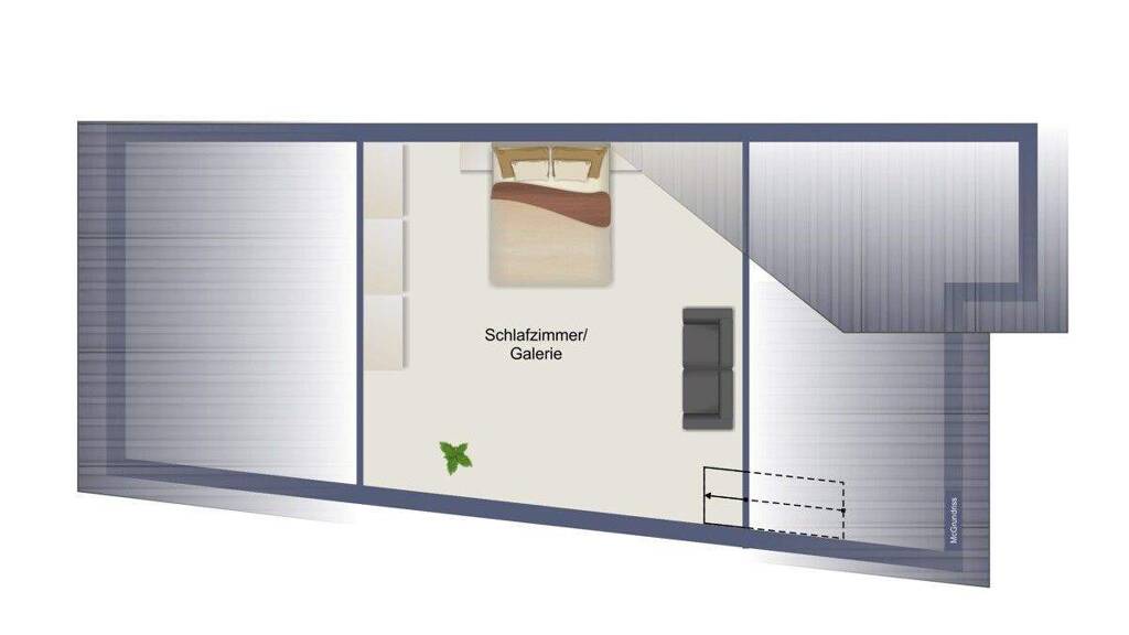 Über eine interne Treppe gelangt man in die obere Ebene der Wohnung. Hier befindet sich ein weiteres Schlafzimmer. Durch die Maisonette-Aufteilung entsteht ein wohnliches und zugleich gut gegliedertes Raumgefühl.