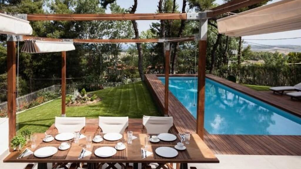 Super luxurious detached villa in Kassandra, Halkidiki, built in the middle of a pine forest, with amazing view to the sea. It consists of three levels of total floor area 330 sqm and has six bedrooms, three living rooms, two kitchens, playroom, four bathrooms and o WC. It is fully furnished and has a lovely garden. Specifically, the semi-basement (165 sqm) consists of a living room, kitchen, dining room, three bedrooms, two bathrooms and a playroom. The ground floor (115 sqm) has a living room with kitchen, a bedroom and a wc. The first floor (65 sqm) consists of a living room, two bedrooms and two bathrooms. There is a private swimming pool in the garden and an outdoors water massage/ Jacuzzi for 4 people. Extras: washing machine and dishwasher, refrigerator - freezer, oven, wood oven, microwave, espresso/cappuccino machine, High definition TV, air conditioning, cable and satellite TV, computer, DVD player, in-home theater, stereo system, high speed Wi Fi connection, video games console, safe. There are available towels and beach towels, shampoo and shower gel, three private sunbeds with an umbrella in front of the Sani Resort sandy beach and free entrance to Sani Resort. The house can accommodate up to 12 people.