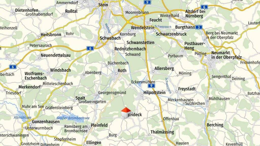 Die Immobilie befindet sich in zentraler Lage der Stadt Heideck im Landkreis Roth. Die Anbindung ist hervorragend: Über die nahegelegene B2 erreichen Sie sowohl die Kreisstadt Roth als auch Schwabach in kurzer Fahrzeit. Nürnberg und Ingolstadt sind ebenfalls gut angebunden, sodass auch Pendler ideale Voraussetzungen vorfinden. Vom nahen Marktplatz aus gibt es im Stundentakt eine Busverbindung nach Hilpoltstein.