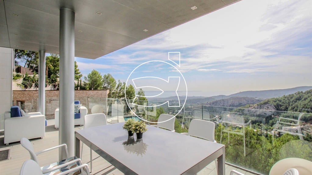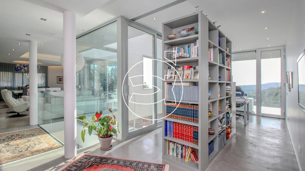 Auf der Hauptebene befindet sich das Wohn-Esszimmer mit Kamin und Terrasse. Daneben befindet sich ein offenes Büro, das sich eine weitere Terrasse mit der modernen und geräumigen Küche teilt, welche mit Bosch-Geräten und einer Krion-Arbeitsplatte ausgestattet ist. Im Obergeschoss befinden sich ein Gästeschlafzimmer und der Zugang zur großen Dachterrasse mit atemberaubendem Meerblick und Sommerküche.