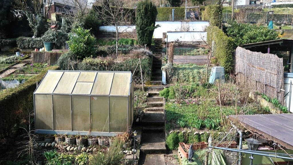 Über die verschiedenen Terrassen/Ebenen gelangen Sie noch ganz nach oben zu einem weiteren Freisitz mit Gartenhaus und Sommerdusche. Hier haben Sie auch einen herrlichen Ausblick über die Oberndorfer Oberstadt.