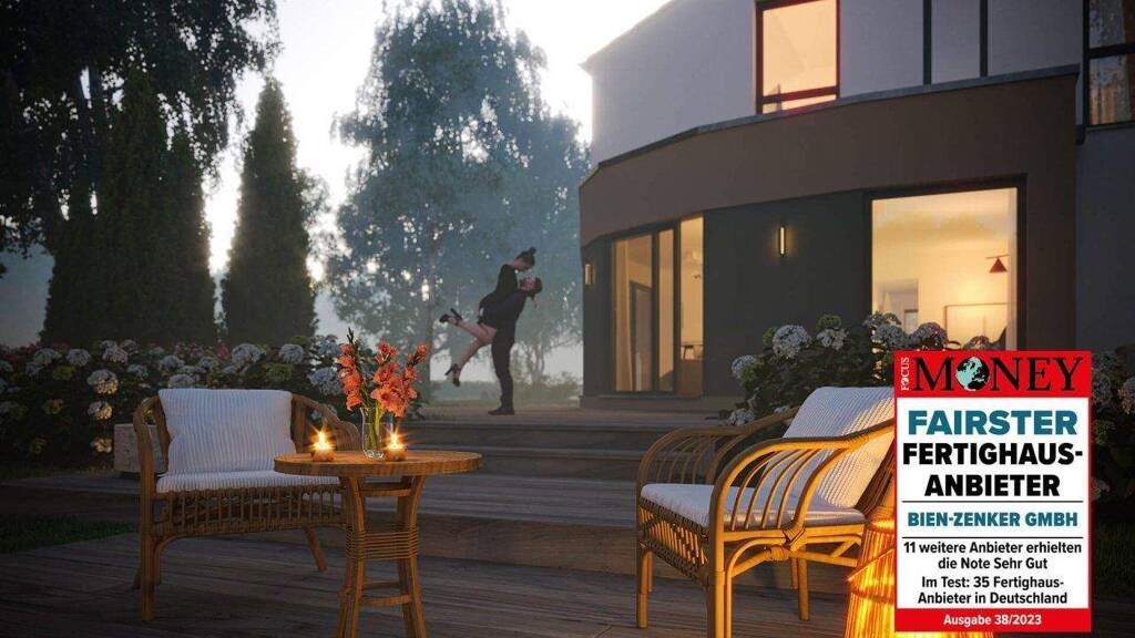 Dass ein Landhaus im Jahr 2024 nicht mit einer Holzverschalung und sehr weiten Dachüberständen versehen werden muss, beweist dieser Entwurf. Das elegante Chalet basiert auf einem schlichten, quadratischen Baukörper, der sich in eine strahlend weiße Putzfassade hüllt. Gartenseitig schließt sich ein Rechteck-Erker mit darüber hinausragendem Balkon an. Mit seinen filigranen Stützen und dem Edelstahlgeländer unterstreicht Letzterer den modernen Charakter des Fertighauses. Großzügige Glaselemente, teilweise übereck ausgeführt, weisen der Sonne den Weg ins Innere und sorgen so für eine positive, lichtdurchflutete Atmosphäre. Landhausfeeling kommt vor allem durch das flach geneigte Dach mit den sichtbaren Pfettenköpfen sowie durch das zusätzliche Schleppdach, unter dem sich der Stellplatz für das Auto befindet, auf. Das Innere des Hauses bietet wie bei allen Bien-Zenker Häusern Wohngenuss pur. Der Grundriss basiert auf der jahrelangen Erfahrung des Hausbauunternehmens. Großzügige Gemeinschaftsbereiche und gemütliche Individualräume werden kombiniert mit cleveren Stauraumlösungen. Das Erdgeschoss wird über eine repräsentative Diele erschlossen. Gleich hinter dem Eingang befindet sich der Technikraum sowie ein flexibel nutzbares Zimmer. Mit einer Größe von knapp 10 m² eignet es sich nicht nur als Homeoffice, sondern auch als zusätzliches Kinderzimmer. Später könnte sich die Hausherrin hier ihr Schlafzimmer einrichten. An ein zweites, ebenerdiges Badezimmer ist auch schon vorsorglich gedacht. Vorbei an der geraden Treppe, unter der genügend Platz für den Bobbycar-Fuhrpark der Kinder ist, geht es in die "gute Stube" - ein luftiges Raumensemble aus den Bereichen Wohnen, Essen und Kochen. Die Gemeinschaftsräume wurden so angelegt, dass ein großer Gestaltungsspielraum entsteht. Der Kochbereich kann beispielsweise mit einer u-förmigen Küche inklusive Tresen ausgestattet werden. Sie punktet einerseits mit viel Stauraum und andererseits mit kurzen Laufwegen. Unter dem Dach liegen die Ruhe- und Privaträume. Zwei gleich große Kinderzimmer, ein Schlafraum mit Ankleide und ein Familienbad mit Wanne und Dusche laden hier zum Träumen ein.