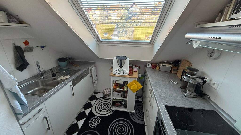 ECKDATEN IM ÜBERBLICK: . tolle Lage in Stuttgart-Rohracker . gute Anbindung an den ÖPNV (Bus) . Mehrfamilienhaus / Baujahr ca. 1967 . 3-Zi.-Wohnung im Dachgeschoss mit einem Wohn-/Esszimmer, 2 Schlafzimmer, Küche, Tageslicht-Bad und Flur . ca. 48,5 qm Wohnfläche . ca. 2,8 qm Nutzfläche (ein Kellerraum im Untergeschoss) . gepflegte, renovierte Innenausstattung / guter Zustand . gefliestes Tageslicht-Badezimmer: Dusche, WC-Element und Waschtisch . Einbauküche (2016) im Kaufpreis inbegriffen . Bodenbeläge: Laminatboden in den Zimmern und im Flur; Bad und Küche sind gefliest . Malerarbeiten (2016) . neue Wohnungseingangstüre (2021) . neue Schließanlage (2022) . Kunststoff-Isolierglasfenster (ca. 2009); Dachflächenfenster (2016) . Gas-Zentralheizung mit zentraler Warmwasserbereitung (2022) . gemeinschaftliche Waschküche und Trockenraum im UG . ein Pkw-Stellplatz (Kaufpreis 8.000,- EUR) . vermietet; aktuelle monatliche Kaltmiete: 500 € (Wohnung), 30 € Pkw-Stellplatz