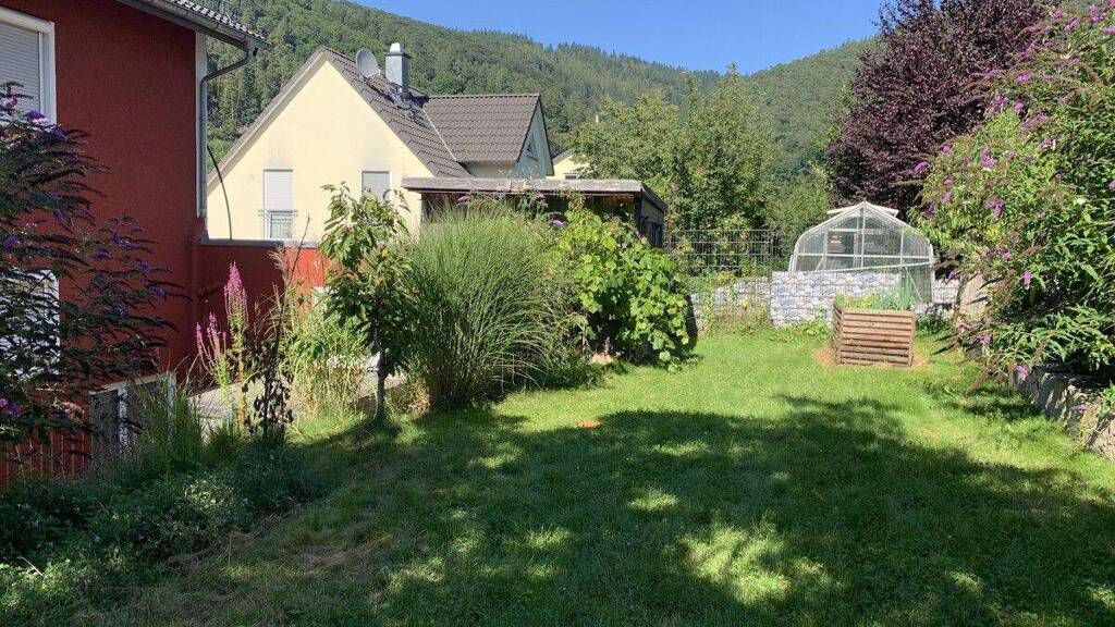 Die erst kürzlich professionell angelegte Außenanlage besticht durch eine wunderschöne Terrasse mit Jura-Steinmauer. Diese grüne Gartenoase mit diversen Bäumen, Gartenhäuschen und Whirlpool ist vollständig von Weiden-Sichtschutzelementen umschlossen. Zwei Balkone vervollständigen das Angebot. Für den Fahrzeugpark stehen eine großzügige Einzelgarage mit Einfahrt und zwei gepflasterte Stellplätze direkt vor dem Haus zur Verfügung.