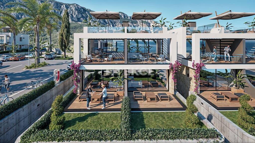 Am Eingang des Geländes befindet sich ein Sicherheitsbarrierensystem, es gibt einen 24/7-Sicherheitsdienst, für jede Wohnung reservierte Parkplätze und einen großen Pool zur gemeinsamen Nutzung auf dem Gelände mit Gemeinschaftsbereichen. Alle Wohnungen sind mit 2 Schlafzimmern auf dem Gelände konzipiert, das landschaftlich gestaltet wird. Die Wohnungen im Erdgeschoss verfügen über einen privaten Gartenbereich. Die Wohnungen im Erdgeschoss verfügen über ein geräumiges Wohnzimmer und eine offene Küche, eine Terrasse und einen Gartenbereich, 2 Schlafzimmer sowie ein Gemeinschaftsbad und -WC. Die Wohnungen im Obergeschoss verfügen über eine Dachterrasse und Meerblick. Zu den Ausstattungsmerkmalen, die den Komfort der Wohnungen erhöhen, gehören die Whirlpool-Infrastruktur auf der Dachterrasse, die Klimaanlagen, die Satelliten- und Internetinfrastruktur sowie die Video-Gegensprechanlage. Die Wohnungen, die kurz- und langfristig ein hohes Mieteinnahmepotenzial in Fremdwährung haben, ziehen während der Ferienzeit die Aufmerksamkeit von Touristen auf sich.