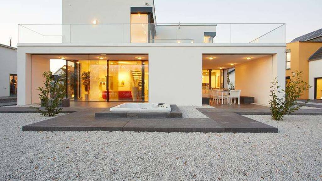 Das ca. 13,50 m x 16 m große Musterhaus bedient sich klarer Formensprache. Der offene Wohn- und