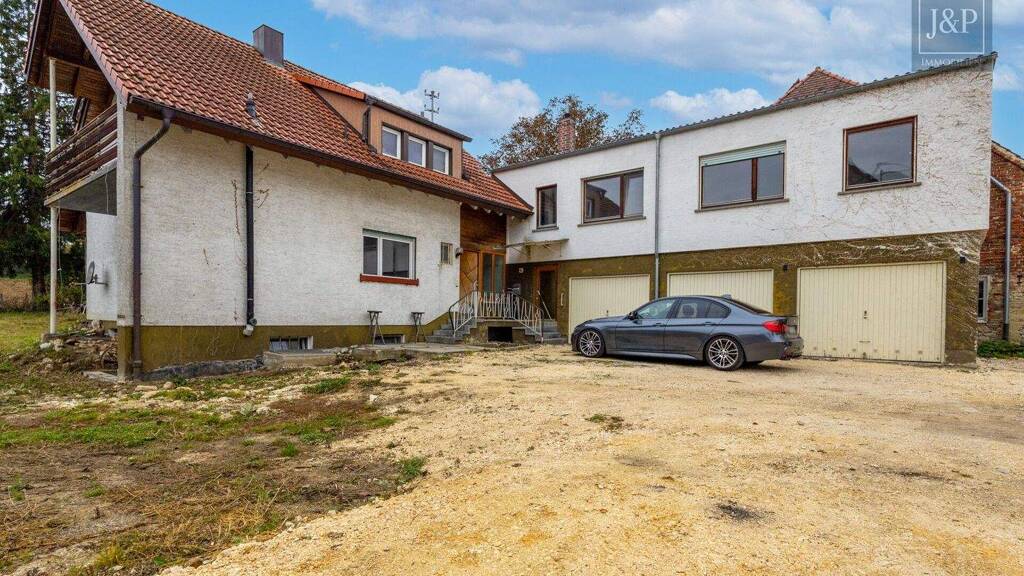 Das Grundstück ist mit einem stark sanierungsbedürftigen Einfamilienhaus mit Zimmern im Flachdachanbau, einer 3-er Garage mit Wohnräumen im Stockaufbau und einem überdachten Sitzplatz bebaut.