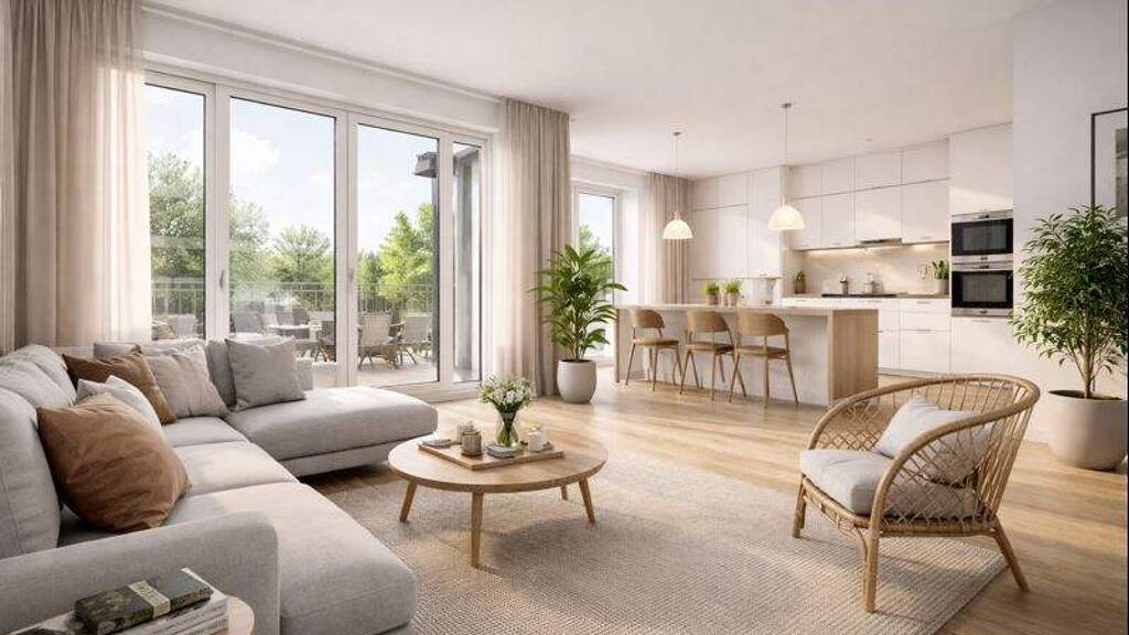 Die Wohneinheit ist perfekt geschnitten für Familien oder Paare mit Platzbedarf. Mittelpunkt ist der großzügige Wohnbereich mit offener Wohnküche, der modernes Leben und gemeinsames Familienleben optimal verbindet.