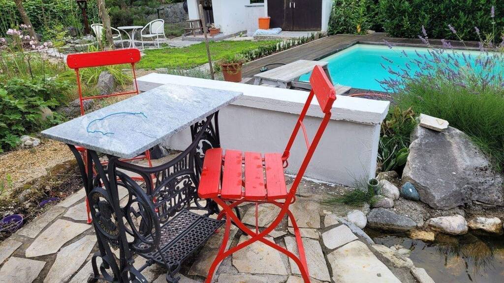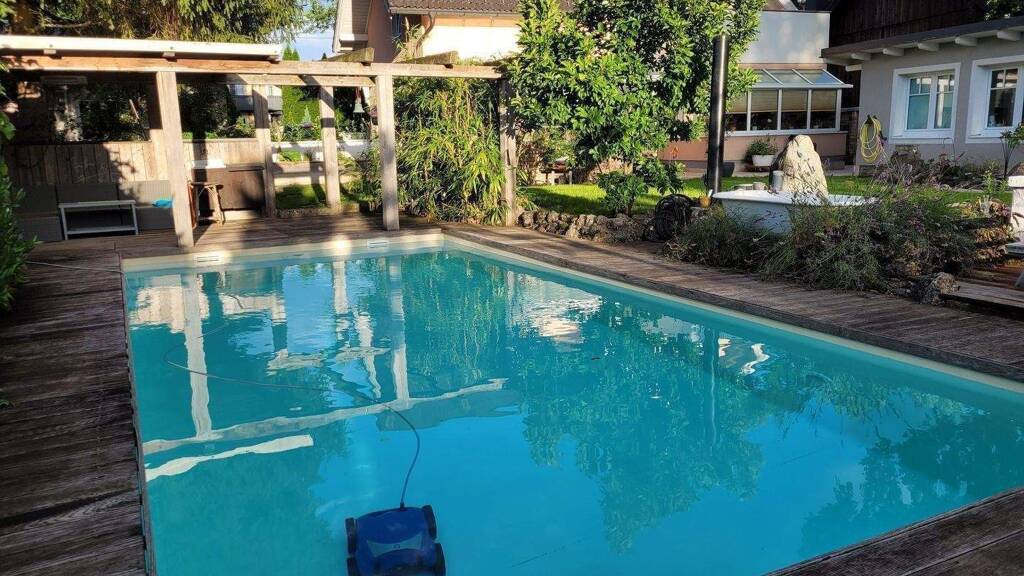 Für zusätzlichen Komfort sorgen eine große Doppelgarage und Parkplätze für bis zu 6 Autos. Der weitläufige Garten, der große Pool mit Gegenstromanlage und der Pavillon am Teich bieten zudem zahlreiche Möglichkeiten zur Entspannung und Erholung im Freien.