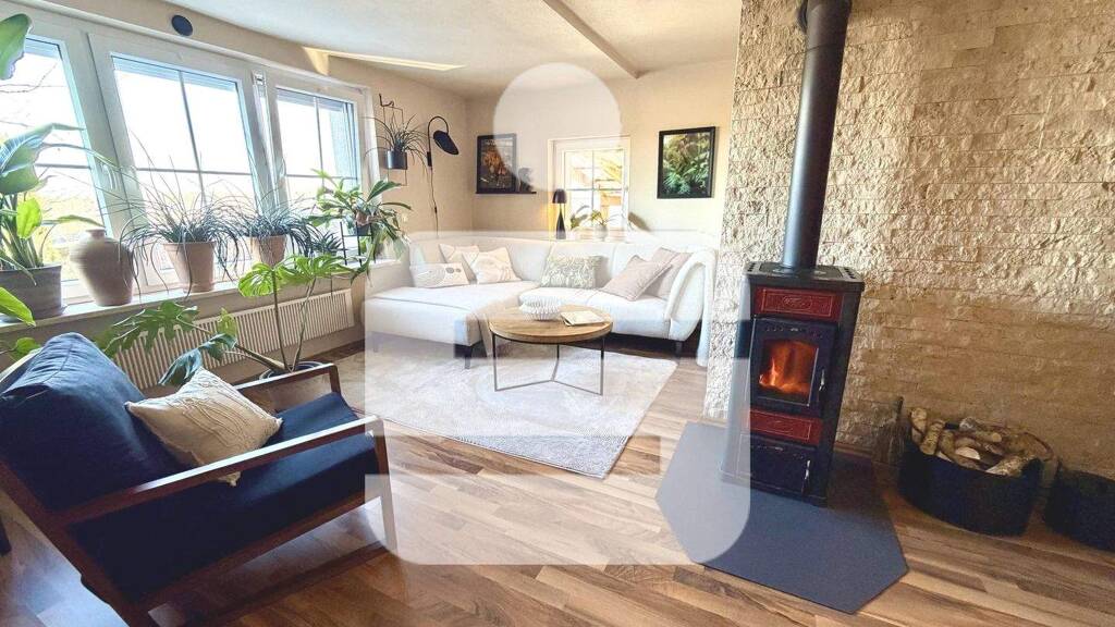 Auf der anderen Seite des Flures gelangen Sie in das zeitlos modernisierte Tageslichtbadezimmer im eleganten Design mit WC, Waschtisch und großer Dusche. Das weitläufige Wohnzimmer mit breiter Fensterfront bietet Stellfläche für eine große Couchlandschaft. Der Schwedenofen verspricht wohlige Wärme an kalten Wintertagen.